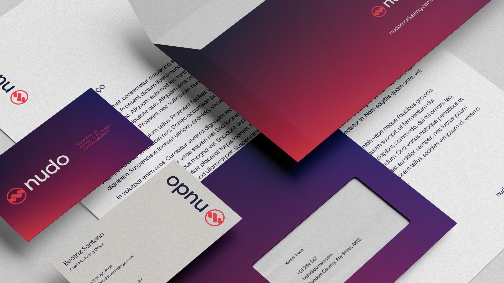 A identidade visual da Nudo é marcada pelo uso das cores magenta e azul-escuro, aplicadas em um degradê elegante que transmite sofisticação, profissionalismo e a energia de quem deseja fazer acontecer em um mercado dinâmico e competitivo.